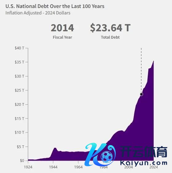△好意思国财政辖下属的财务数据网站袒露的数据泄漏,好意思国国债总和从2014年的23.64万亿好意思元升至2024年的超36万亿好意思元,涨幅超52%,这一趋势举座上仍在执续加速。