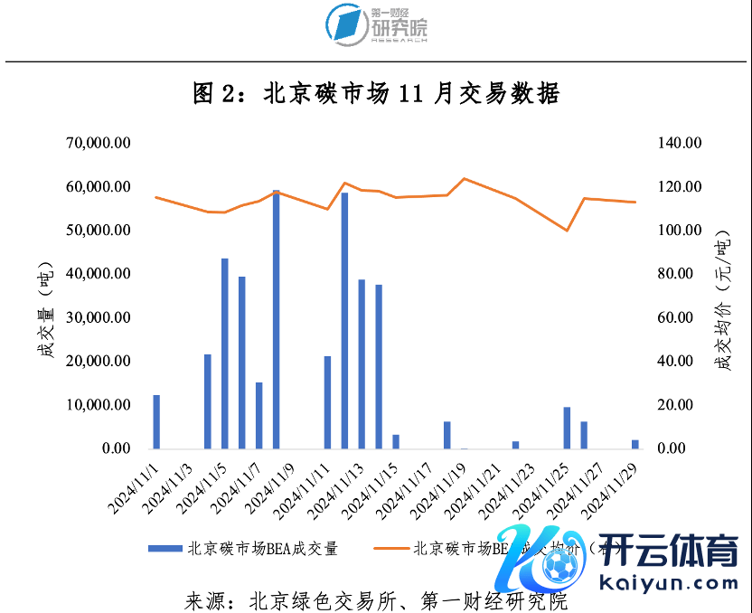 11月北京碳市集碳排放配额(BEA)成交量37.93万吨,成交额4368.79万元,成交均价115.18元/吨。11月临了一个交游日成交均价113.30元/吨,较10月临了一个交游日成交均价116.73元/吨下落2.94%。抑制11月30日,BEA累计成交量5764.98万吨(公开交游2073.98万吨,条约转让3691.00万吨),累计成交额31.05亿元。