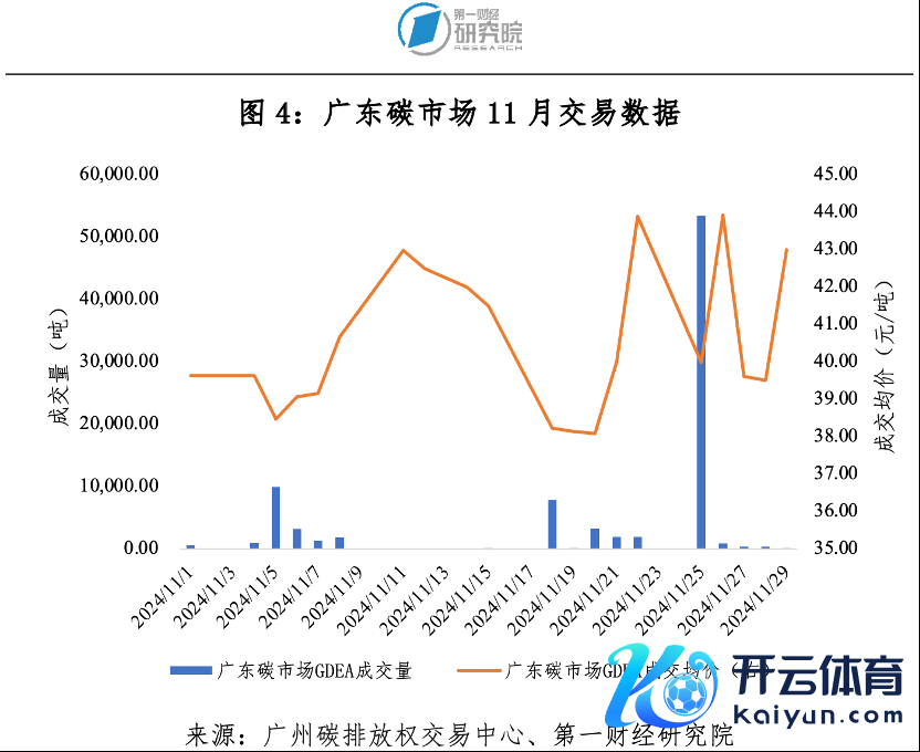 11月广东碳市集碳排放配额(GDEA)成交量8.91万吨,成交额353.69万元。时辰,最高价43.95元/吨,最廉价38.00元/吨,成交均价39.69元/吨。11月临了一个交游日收盘价43.01元/吨,较10月临了一个交游日收盘价39.23元/吨高涨9.64%。抑制11月30日,GDEA累计成交量2.29亿吨,累计成交额66.21亿元。