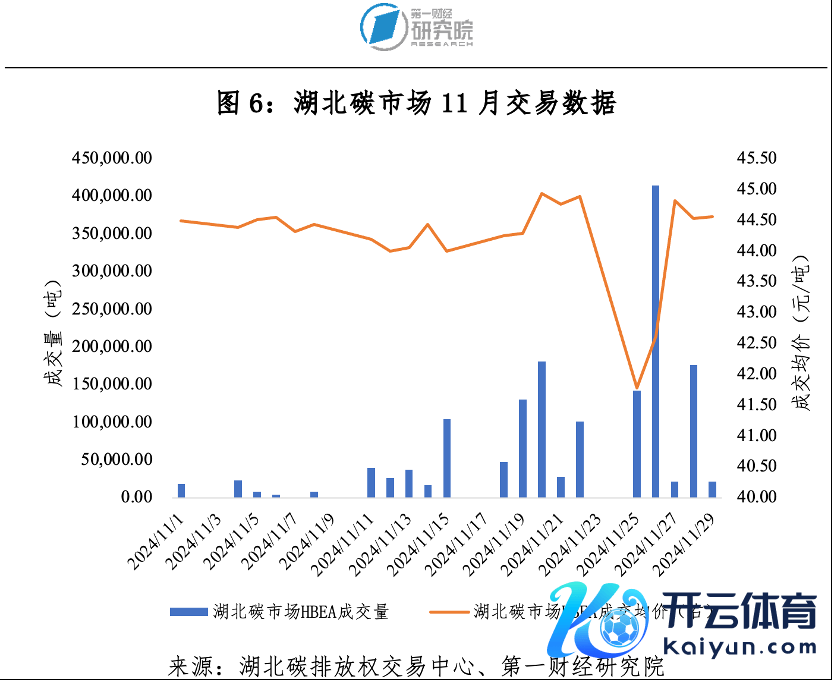 11月湖北碳市集碳排放配额(HBEA)交游成交量156.08万吨,成交额6829.91万元。时辰,最高价45.96元/吨,最廉价40.30元/吨,成交均价43.76元/吨。11月临了一个交游日收盘价44.57元/吨,较10月临了一个交游日收盘价44.78元/吨下落0.47%。抑制11月30日,HBEA(不包括远期、拍卖、逆回购和还碳)累计成交量1.36亿吨,累计成交额34.15亿元。