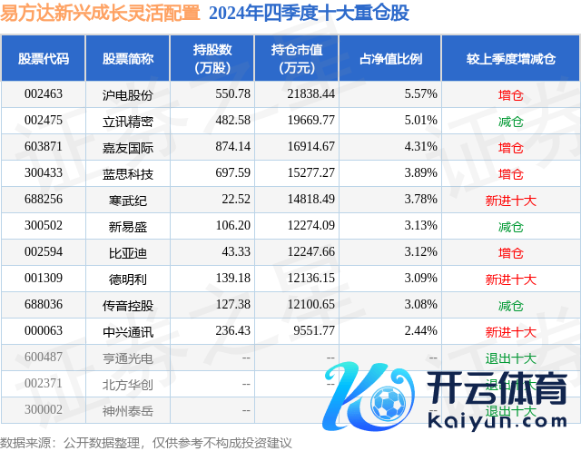易方达新兴成长纯真成立为搀和型-纯真基金,笔据最新一期基金季报披露,该基金金钱成立:股票占净值比86.89%,无债券类金钱,现款占净值比12.4%。基金十大重仓股如下: