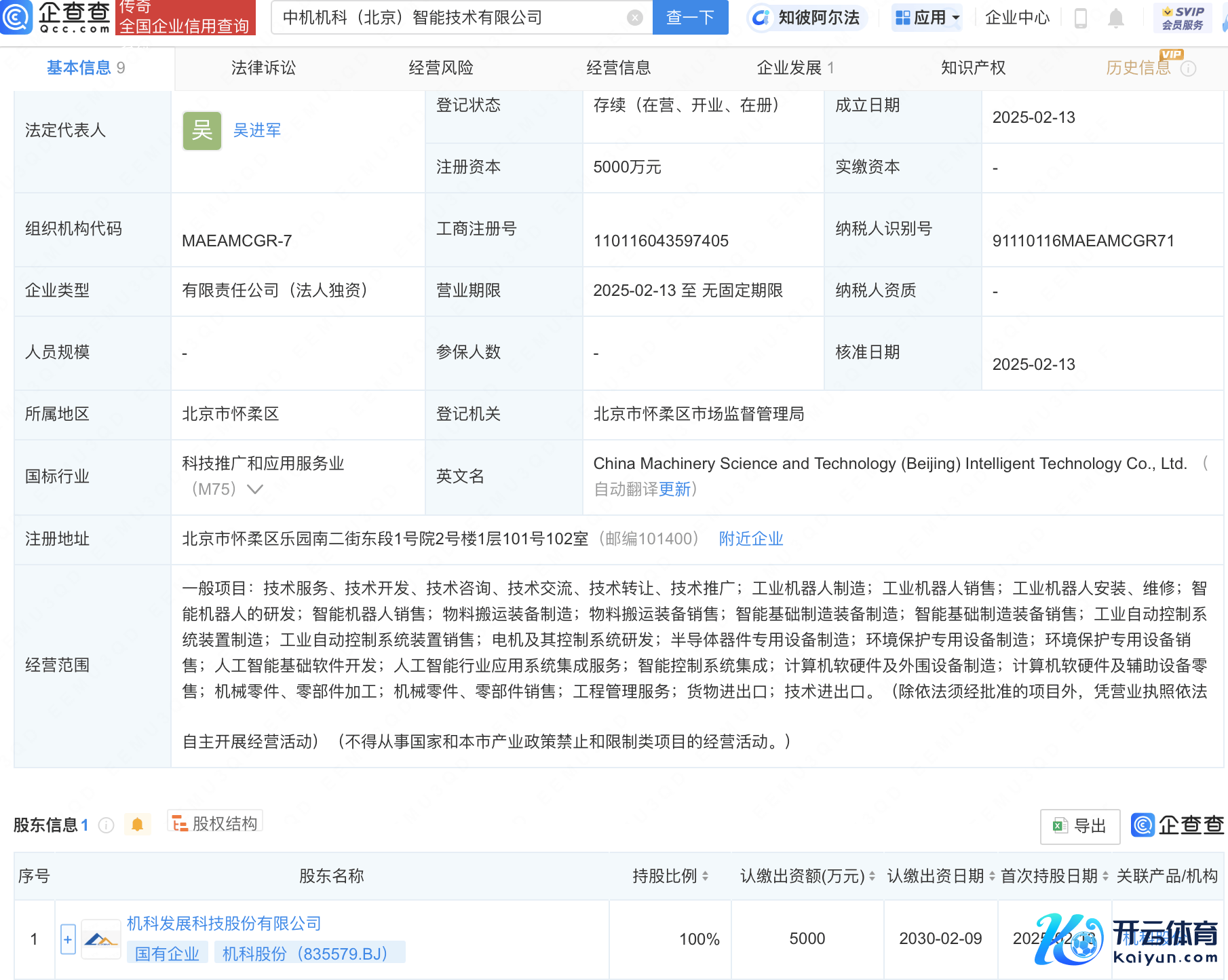 企查查APP深入,近日,中机机科(北京)智能技艺有限公司成立,法定代表东说念主为吴进犯,注册本钱5000万元,霸术限制包含:智能机器东说念主的研发;智能机器东说念主销售;半导体器件专用开发制造;东说念主工智能基础软件开发等。企查查股权穿透深入,该公司由机科股份(835579)全资捏股。