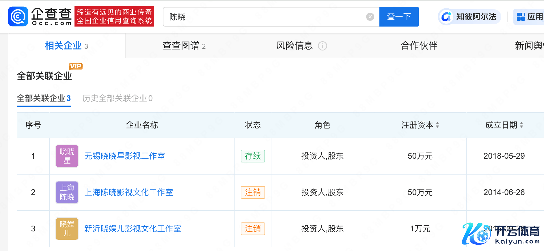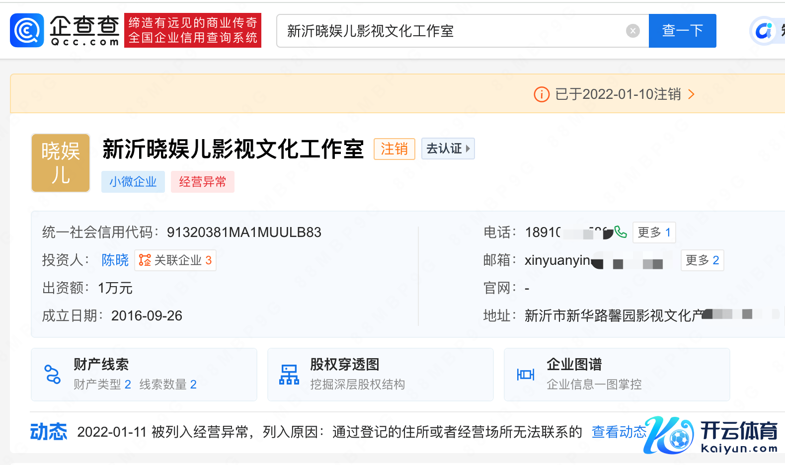 据企查查APP表示,陈晓共关联3家责任室,均担任投资东说念主脚色,其中2家为刊出状况,仅存续1家无锡晓晓星影视责任室。值得一提的是,其全资抓股的新沂晓娱儿影视文化责任室于2021年因通过登记的住所大约贪图场面无法相干,被列入贪图十分名录,尔后于2022年1月该公司刊出,刊出原因为方案结果。企查查表示,陈晓陈妍希无交易关联。
